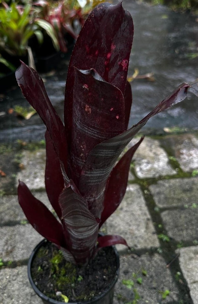The ‘Red Form’ of Aechmea fasciata is a highly sought-after cultivar of the popular Silver Vase (or Urn Plant). While the standard species is known for its grey-green leaves, this variety boasts striking wine-red to burgundy foliage. The leaves retain the iconic silvery-white horizontal bands (trichomes) of the parent species, creating a dramatic high-contrast look that is particularly effective in modern interiors.