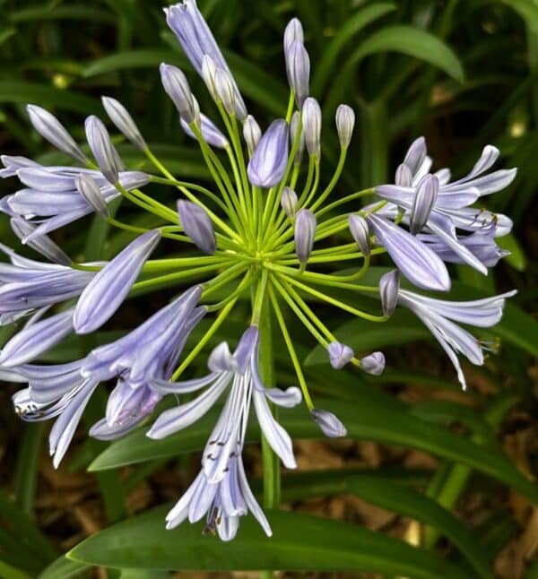 Agapanthus orientalis, often referred to as the Lily of the Nile, is a staple of Australian gardening due to its near-indestructible nature and reliable summer display. This evergreen variety forms dense mounds of fleshy, dark green foliage that remains attractive year-round. In late spring and throughout summer, it produces spectacular floral displays where dozens of small, trumpet-shaped blue flowers form a large, rounded head (umbel) atop a thick stalks that can reach up to 1 metre in height.