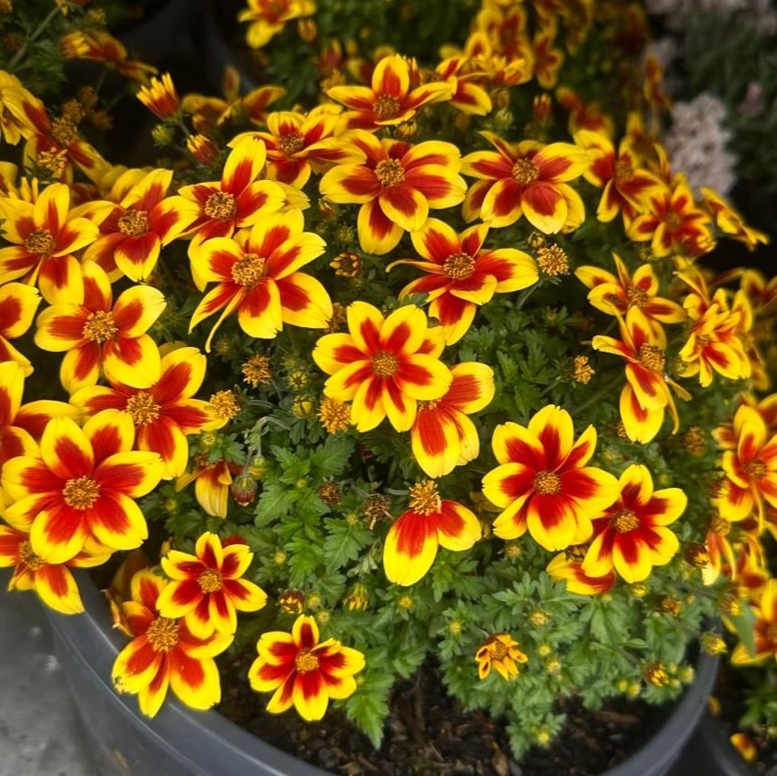 Bidens ferulifolia, also known as Apache Beggarticks or Fern-Leaved Beggarticks, is a fast-growing, evergreen perennial often grown as an annual in cooler climates. It features delicate, fern-like foliage and an abundance of small, bright golden-yellow daisy flowers that bloom profusely from spring through to autumn. Its low-growing, mounding habit makes it perfect for filling in garden beds, using as a groundcover, or as a vibrant ‘spiller’ in hanging baskets and containers. This plant is a fantastic choice for attracting bees and butterflies to the garden.