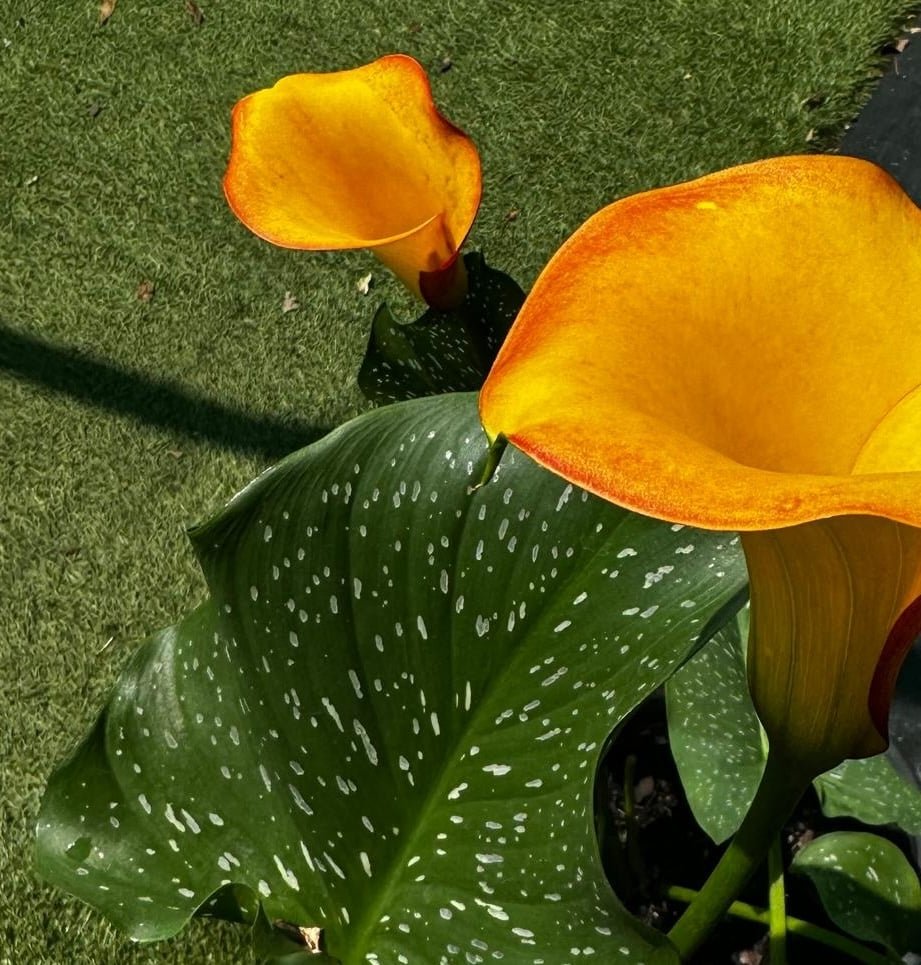 The Calla Lily is a striking tuberous perennial with glossy, arrowhead-shaped leaves and elegant, sculpted, trumpet-shaped flowers in white, pink, yellow, or deep purple.