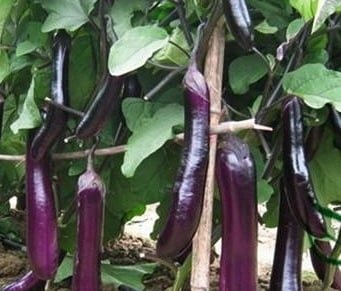 ‘Long Purple’ Eggplant (Solanum melongena) is a popular, high-yielding variety of eggplant (aubergine) known for its slender, elongated, and glossy dark-purple fruit. This type is generally less bitter than the large globular varieties, making it excellent for grilling, roasting, and slicing into stir-fries. As a warm-season annual, it requires a long, hot growing period to produce its fruit, which hangs from the robust, bushy plants.