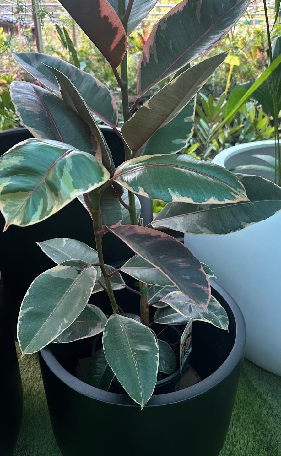 Ficus elastica ‘Ruby’ is a stunning and very popular cultivar of the Rubber Tree. It is prized for its dramatic tri-colour variegation, which features a vibrant mix of deep green, creamy white, and prominent shades of bright pink or ruby red, especially noticeable on the new growth and leaf edges. These large, thick, leathery leaves are held on a sturdy, upright stem, making it an excellent architectural plant for interior spaces. It is generally considered a hardier and easier-to-manage alternative to many other large Ficus varieties, thriving best when given adequate bright light to maintain its rich colours.