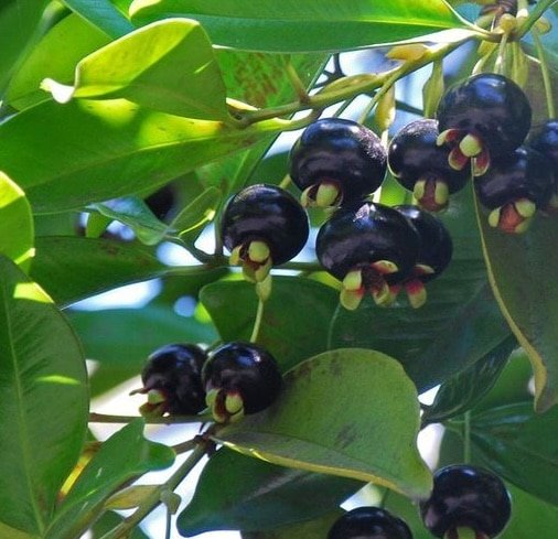 In spring, it produces fluffy white flowers in the leaf axils, followed quickly (often within weeks) by the fruit. The fruit resembles a large cherry, turning from green to bright red and finally to a shiny, deep purple or black when ripe. The flesh is translucent, soft, sweet, and juicy, with a hint of resinous flavour. It is excellent for fresh eating, jams, and preserving. It makes a beautiful, dense screen or a stand-alone feature tree, especially suited to warm and subtropical Australian climates.