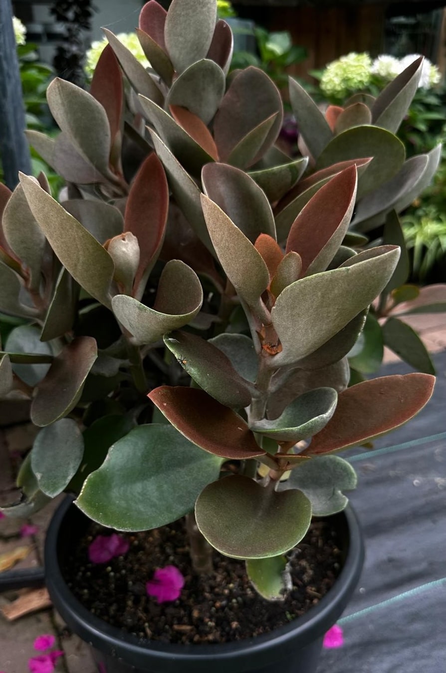 Kalanchoe orgyalis, commonly known as Copper Spoons, is a slow-growing succulent shrub that originates from Madagascar. It is famous for its unique foliage; the leaves are structural, slightly folded, and covered in dense, felt-like hairs. The upper side of the leaf displays a rich, rusty copper or bronze colour, while the underside is a contrasting silvery-grey. As the leaves age, the copper hue can fade to a more olive or silver-green, creating a beautiful multi-toned effect on the same plant.