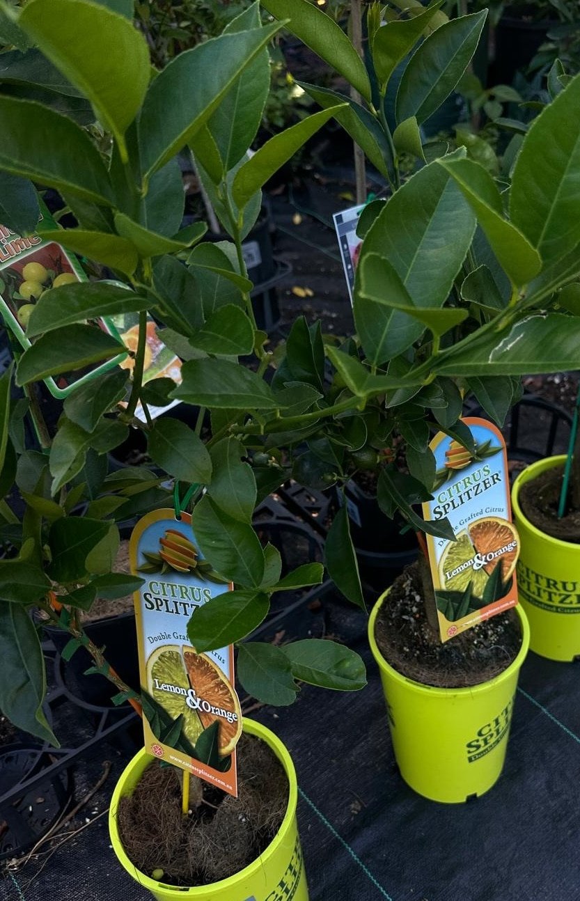 A Citrus Splitzer is a single tree where two different compatible citrus varieties—in this case, a Lemon (e.g., Eureka or Lisbon) and an Orange (e.g., Navel or Valencia)—are expertly grafted onto one hardy rootstock. This compact growing method is perfect for small gardens, courtyards, or large pots, as it allows for dual harvests of different fruits from the space of one tree. It offers ornamental appeal with its glossy, evergreen foliage, fragrant spring blossoms, and colourful fruit ripening at different times.