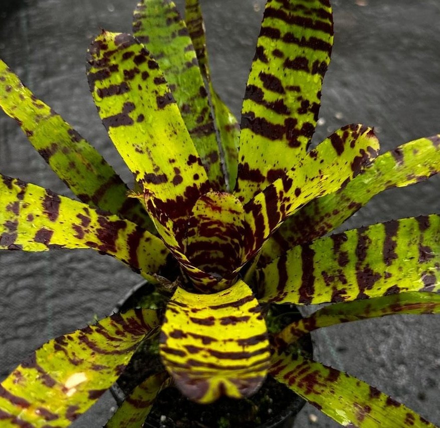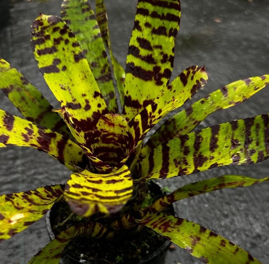 ‘Storm Blade’ is a modern Neoregelia hybrid (likely a Chester Skotak creation or similar Thai hybrid) prized for its dramatic, “stormy” appearance. It forms a compact, relatively flat rosette of narrow, lance-shaped leaves. The foliage is a base of mid-to-bright green, but it is heavily overlaid with intense, dark red-to-burgundy spotting, speckling, and broken horizontal bands. This gives the plant a serrated, almost aggressive visual texture that lives up to its name.