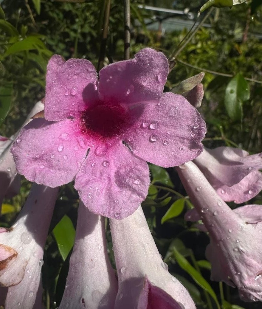 Pandorea jasminoides ‘Bower of Beauty’ is a vigorous Australian native climber with glossy leaves and stunning pink, trumpet-shaped flowers. A fast, colourful screen.