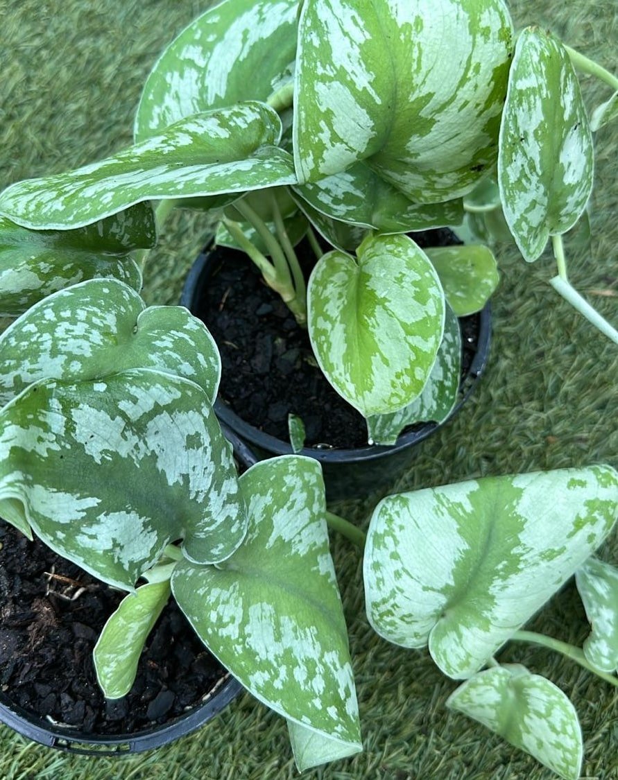 Scindapsus pictus ‘Exotica’, often confused with the common Pothos (Epipremnum), is a spectacular tropical trailing vine known as Satin Pothos, due to the subtle shimmer on its leaves. The ‘Exotica’ cultivar is distinguished by having significantly larger leaves and a much heavier concentration of silver variegation compared to the standard S. pictus ‘Argyraeus’. The leaves are dark green, heart-shaped, and covered in large, irregular, blotchy patches of metallic, luminous silver-grey. This variegation gives the foliage a beautiful matte texture and a “painted” appearance. It is an excellent, durable houseplant for hanging baskets, trailing from a shelf, or climbing a moss pole, offering a unique silvery contrast to other green foliage plants