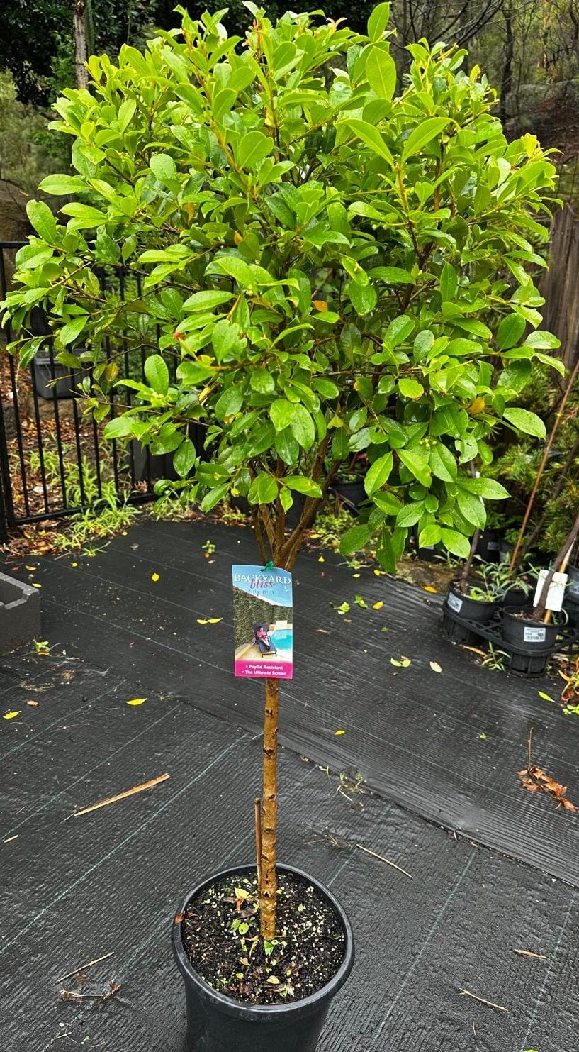 Syzygium paniculata ‘Backyard Bliss’ is a premier Australian Lilly Pilly cultivar, specifically pruned here into a “standard” or lollipop form. This means it features a tall, clear trunk topped with a dense, rounded ball of foliage. The leaves are small, glossy, and a deep forest green, with new growth emerging in attractive shades of bronze and copper. It is highly regarded in Australian horticulture for its exceptional resistance to psyllids, the tiny insects that cause unsightly pimples on the leaves of many other Lilly Pilly varieties.